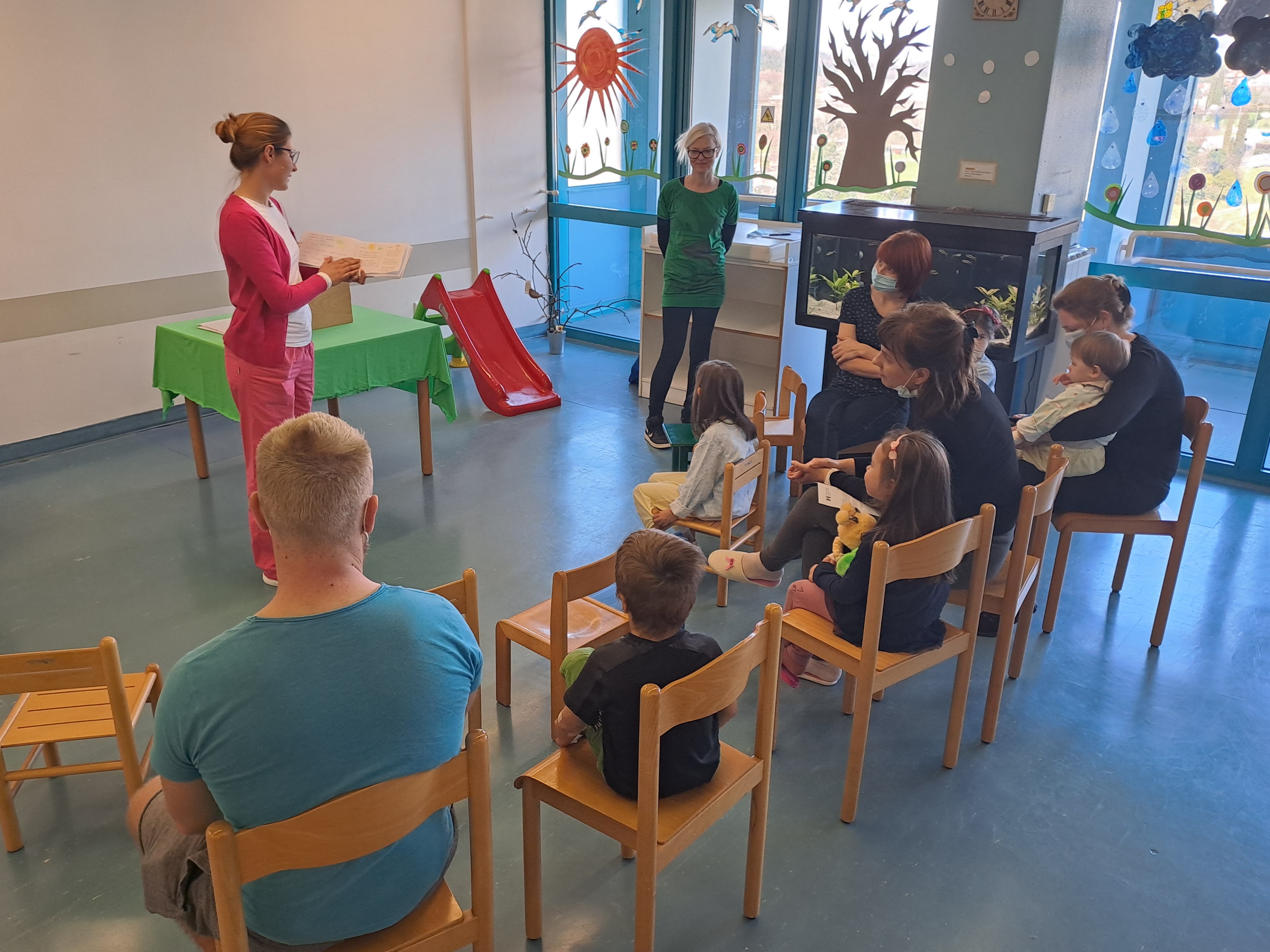 ’’Naša predstava je bila kot zmeraj raznolika in bogata. Najprej smo izvedli predstavo z metodo kamišibaj – to je pripovedovanje zgodbe ob slikah. Otrokom smo pripovedovali o Mucku mjavu in letnih časih. Ker je danes svetovni dan poezije, smo jim predstavili tudi tri pesmi v zvezi z boleznijo, v zvezi s preventivo za zdravje. Za konec pa smo otrokom razdelili tri majhne, ročno izdelane zvezke, ki so jih z veseljem okrasili. Vanje so kaj narisali, kaj napisali. Na ta način pri njih vzpodbujamo ustvarjanje na likovnem in poetičnem področju.’’
