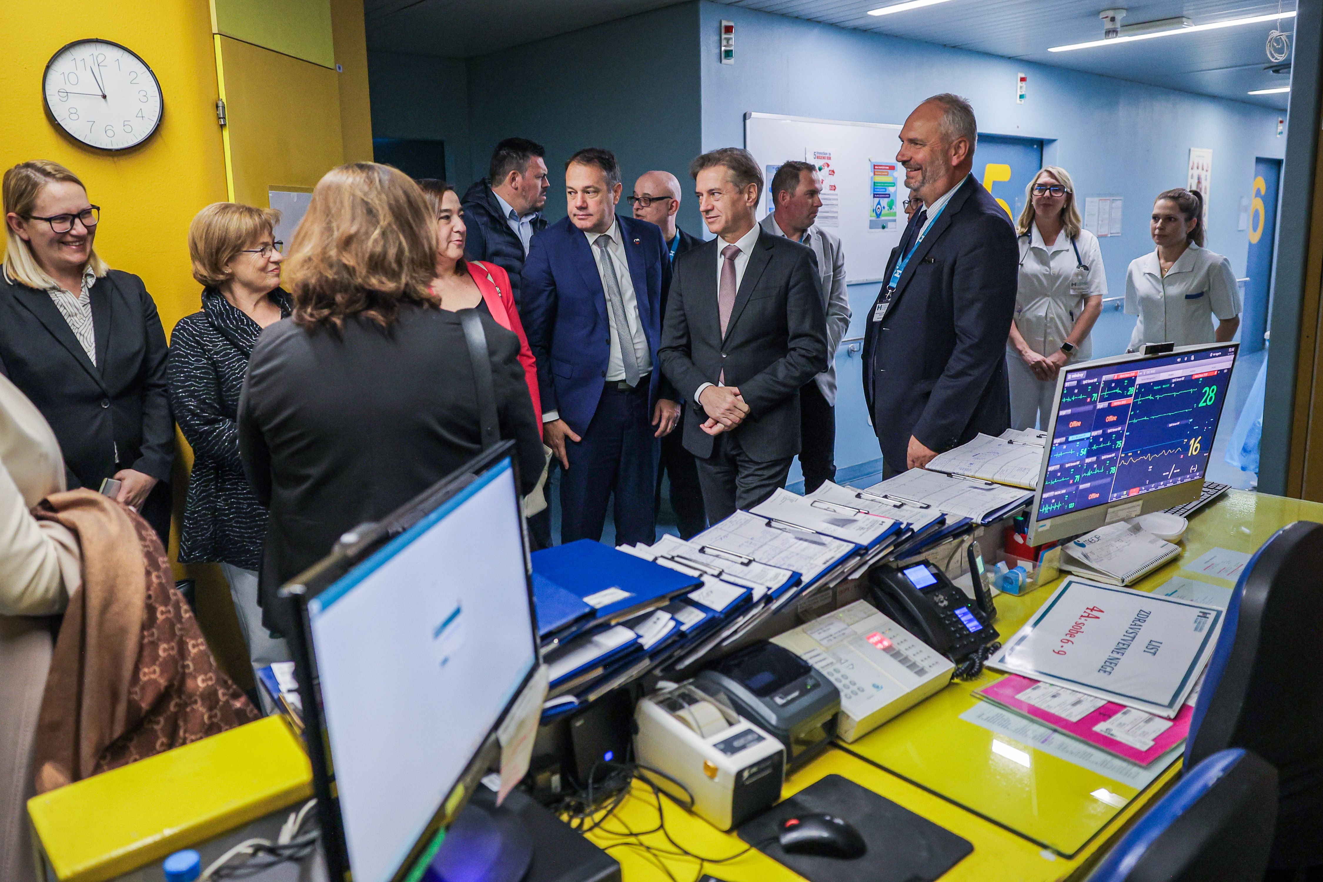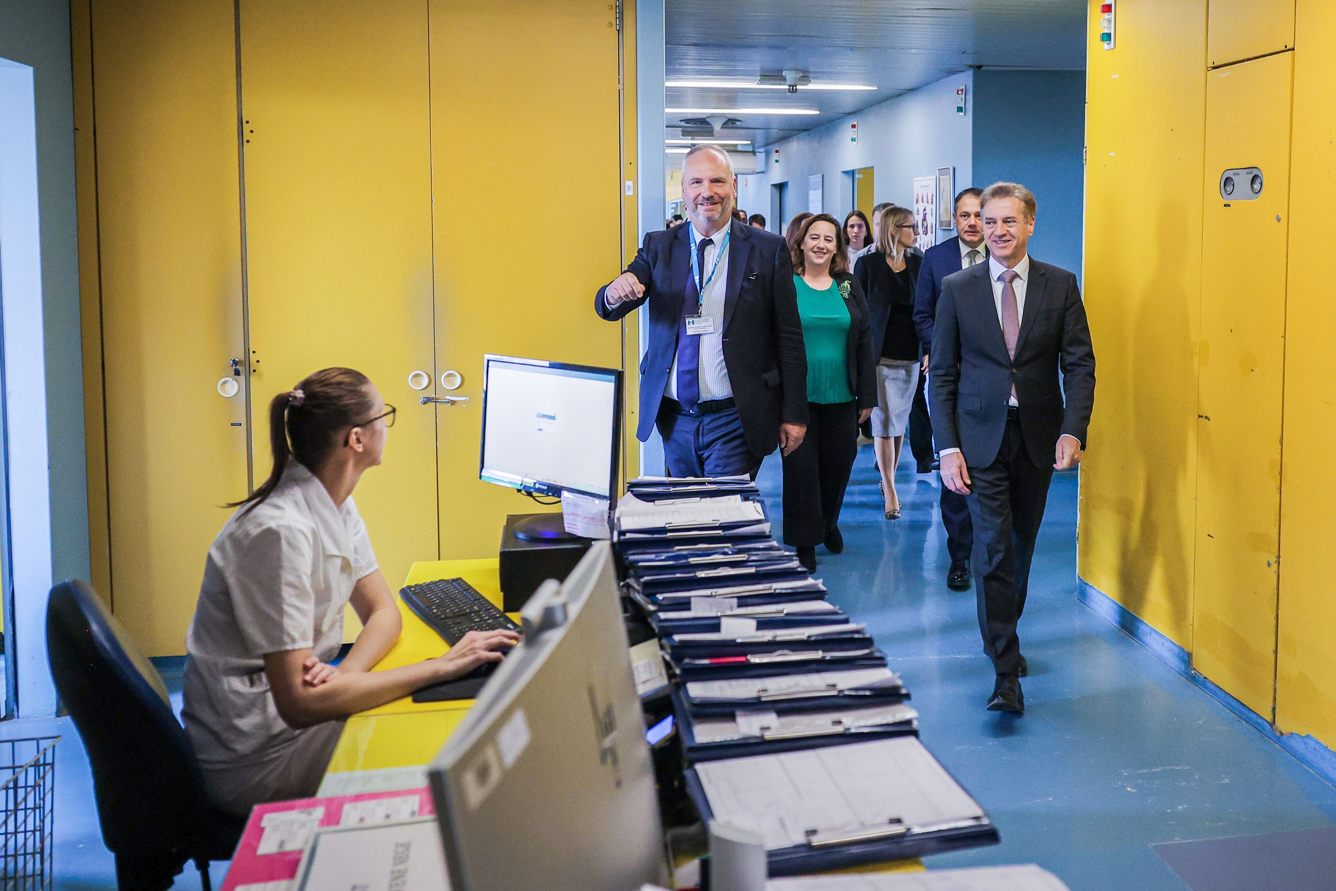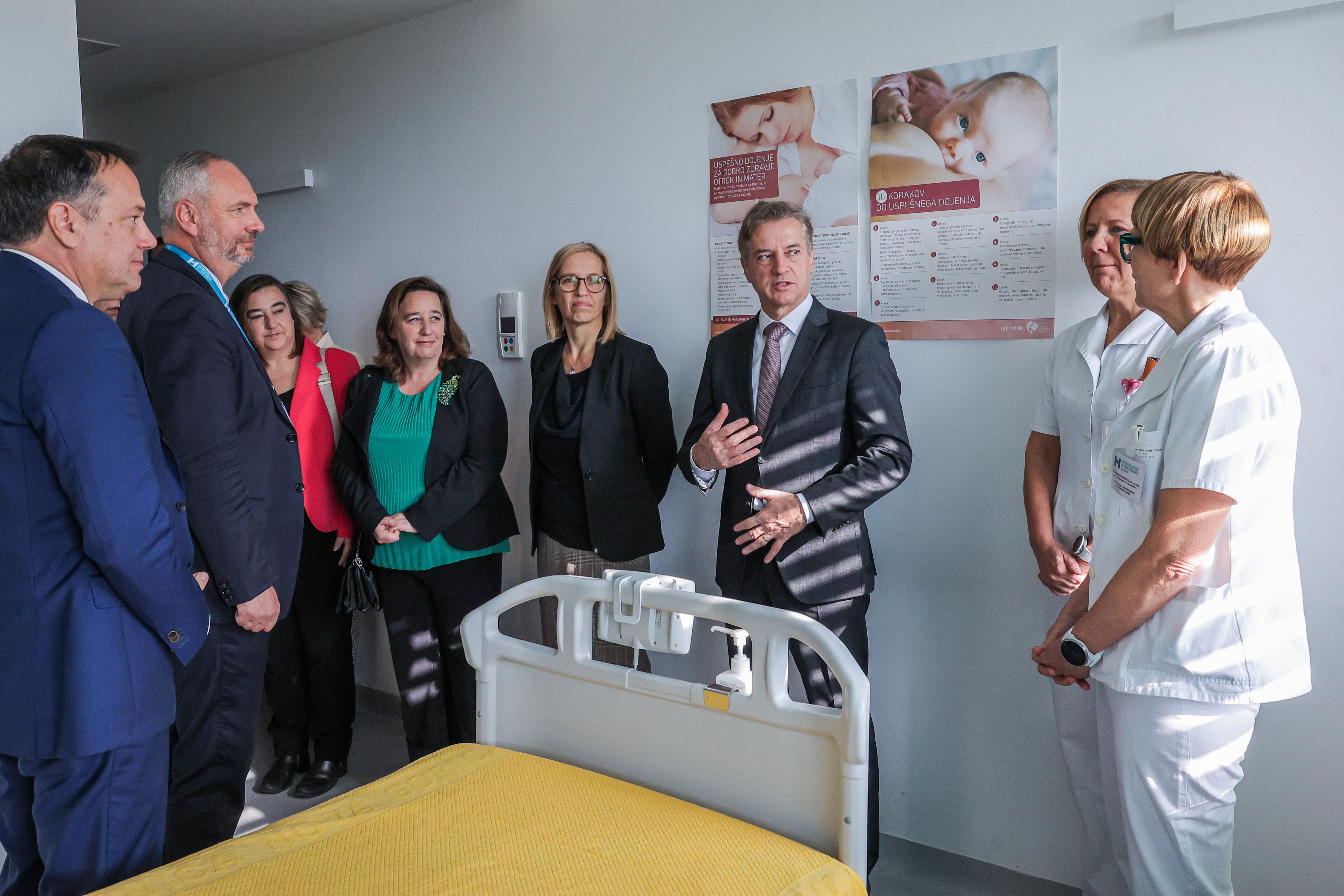 Z vladno delegacijo smo si najprej ogledali obnovljeno 5.B nadstropje, sledila je predstavitev kardiološkega oddelka kot primer stare infrastrukture. V porodnišnici smo se sprehodili skozi porodni blok in sodobne sobe, ki smo jih prenovili s pomočjo projekta EZTS-GO.