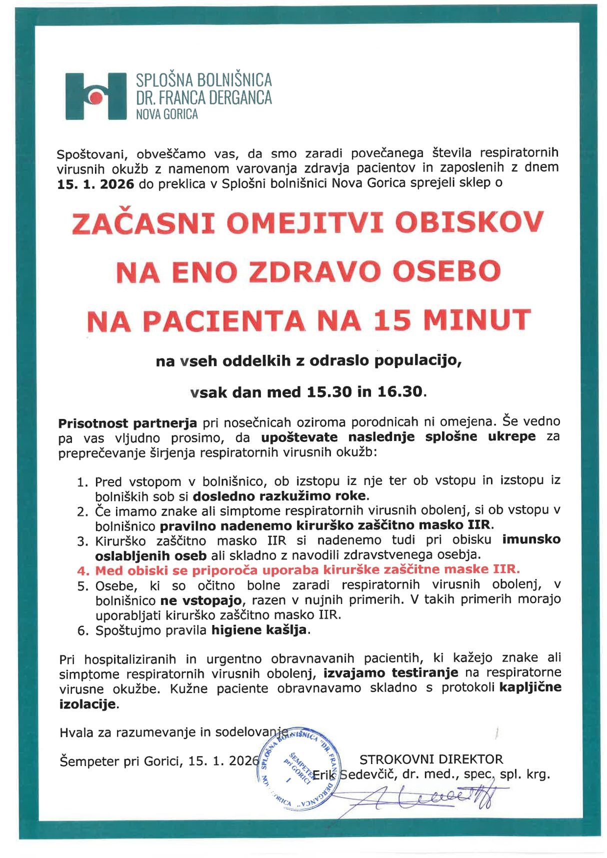 Spoštovani, obveščamo vas, da smo zaradi povečanega števila respiratornih virusnih okužb z namenom varovanja zdravja pacientov in zaposlenih z dnem 15. 1. 2026 do preklica v Splošni bolnišnici Nova Gorica sprejeli sklep o